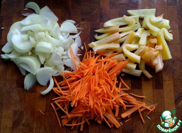 В кастрюлю добавить перец, лук, морковь, перемешать.