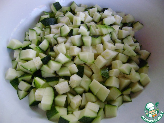 Кабачки нарезаем произвольными кубиками. Я кожицу не чищу, так как у меня цукини. Но если кабачки старые с грубой кожицей, то ее счищаем.