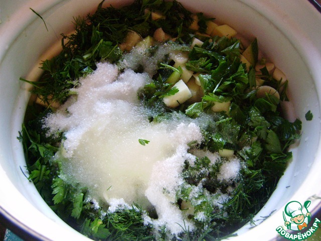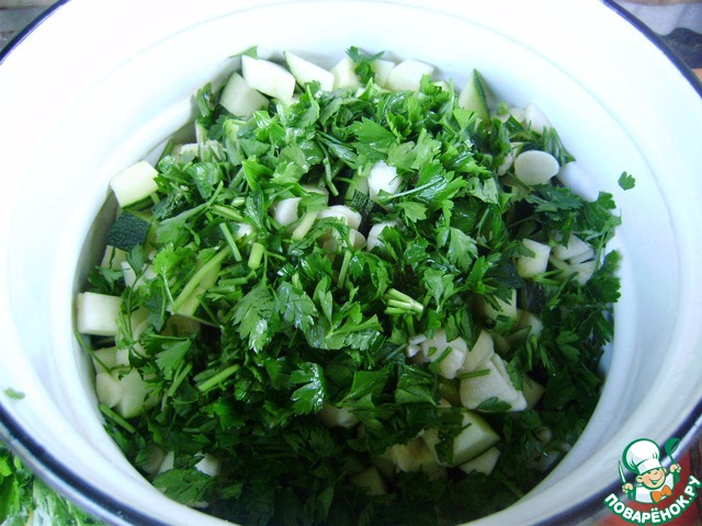 Зелень мелко крошим.