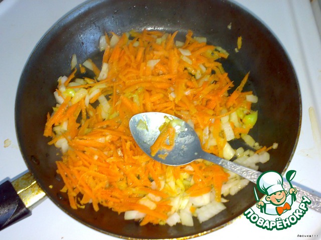 Морковь трем на крупной терке, лук и перец режем средними кусочками и обжариваем в отдельной сковороде.