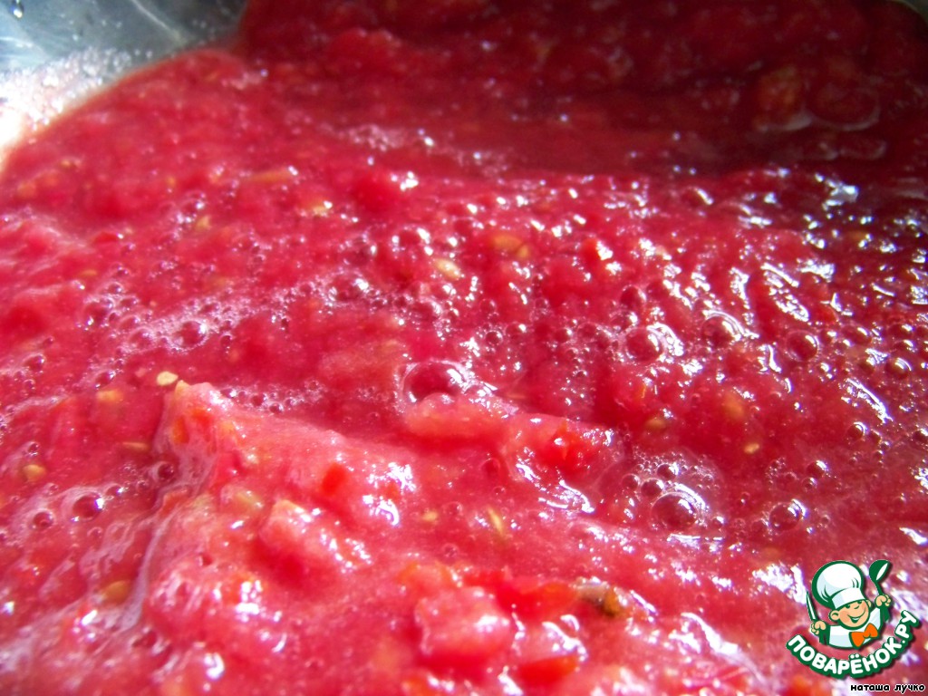 Готовим маринад: 0,7 кг помидор перемолоть в пюре, добавить туда уксус, масло, соль, сахар и измельчённый чеснок. Когда маринад закипит, отправляем туда кабачки. Готовим на небольшом огне.