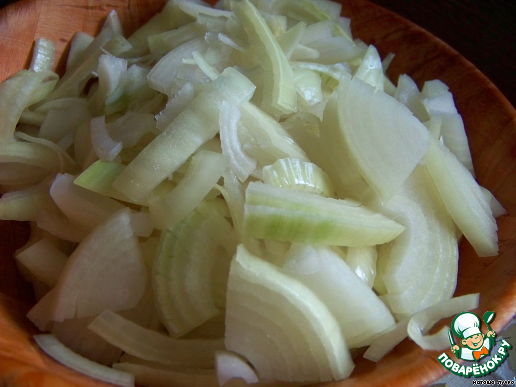 Через 20 минут добавить лук, нарезанный четвертинками колец.
