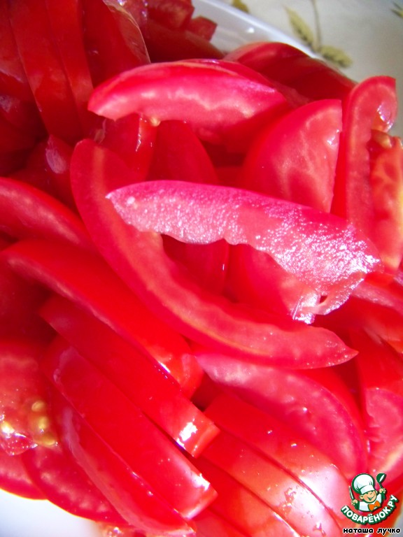 Ещё через 15 минут помидоры, нарезанные полукольцами.