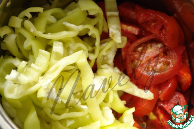 В кастрюлю наливаем растительное масло и выкладываем помидоры, затем перец.