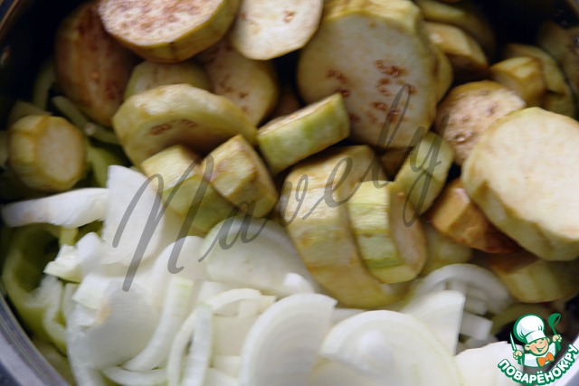 Затем лук и баклажаны, прогреваем на среднем огне минут 15.