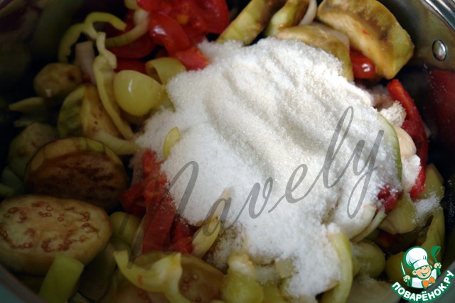 Затем добавляем сахар, соль, уксус, доводим до кипения и провариваем минут 30-40, изредка помешивая. В это время стерилизуем банки и по прошествии времени раскладываем горячий салат в теплые банки, закрываем крышками и храним до зимы в прохладном месте. Для хранения в квартире нужно дополнительно простерилизовать салат в течение 10 минут.