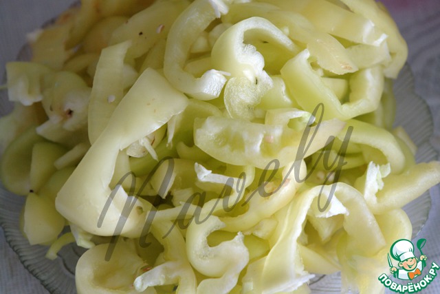 Болгарский перец нарезаем полосками 1 см. толщиной.