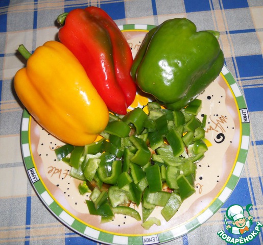 Перец также нарезаем длинными, не очень широкими ломтиками. Я пробовала строгать на комбайне, вкус изменился. Перцы лучше брать разноцветные, чтобы салат получился веселый.