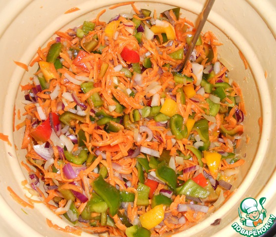 На дно большой кастрюли (у меня 9 литров) наливаем растительное масло, кладем морковь, лук и перец. Насыпаем сахар и соль.