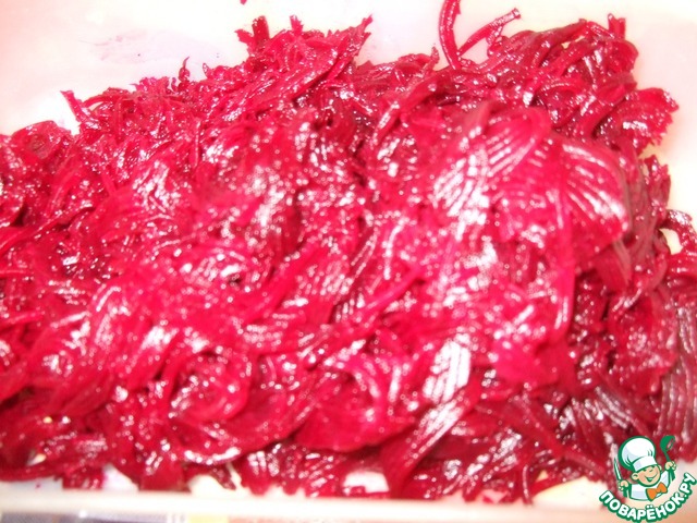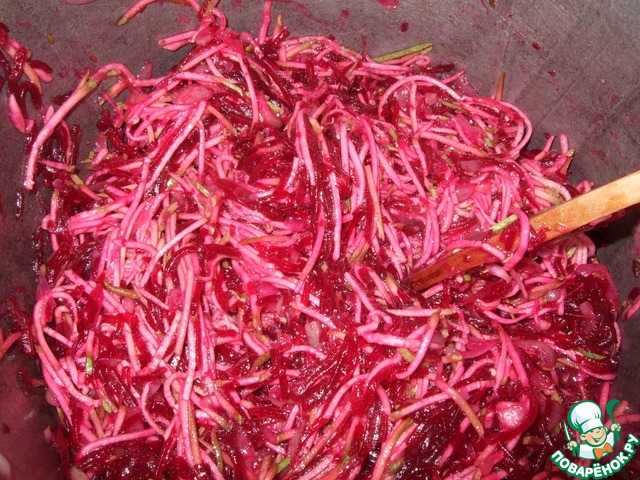 Наливаем масло, как нагреется, жарим лук до золотистого цвета, добавляем соль, сахар, уксус, потом кладём кабачки и свеклу и всё тушим 15-20 мин. помешивая.