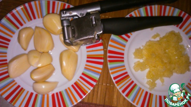 Пока огурцы замачиваются, чистим чеснок, и через пресс его пропускаем.