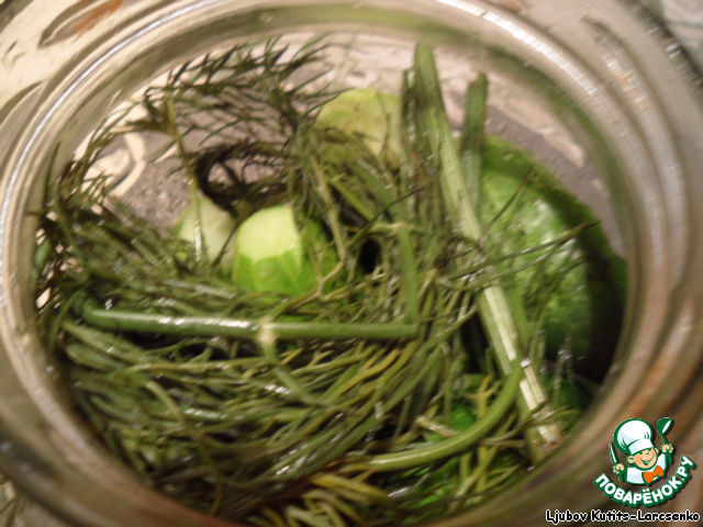 "Приготовить 1,8 кг толстых огурцов средней величины. Обрезать их с обеих сторон, попробовать, не горчат ли. Обмыть и в нескольких местах проколоть кончиком ножа. Тщательно вымыть 5-литровую стеклянную банку. В кастрюле, хорошо очищенной от жира, вскипятить 2 л подсоленной воды".