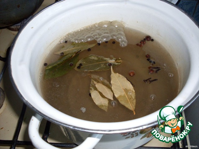 Приготовить маринад: в кастрюлю влить воду, добавить соль, сахар, перец, гвоздику, лавровый лист. Прокипятить минуты 2-3, снять с огня. Через минут 5 в маринад добавить уксус, дать ему немного настояться.