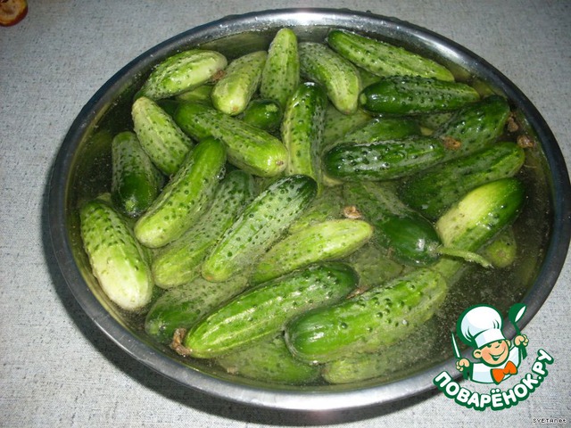 Свежесобранные огурцы замочить на два-три часа в холодной воде.