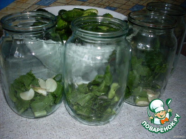 На дно литровых банок положить листья или коренья хрена и 1-2 зубка чеснока.
