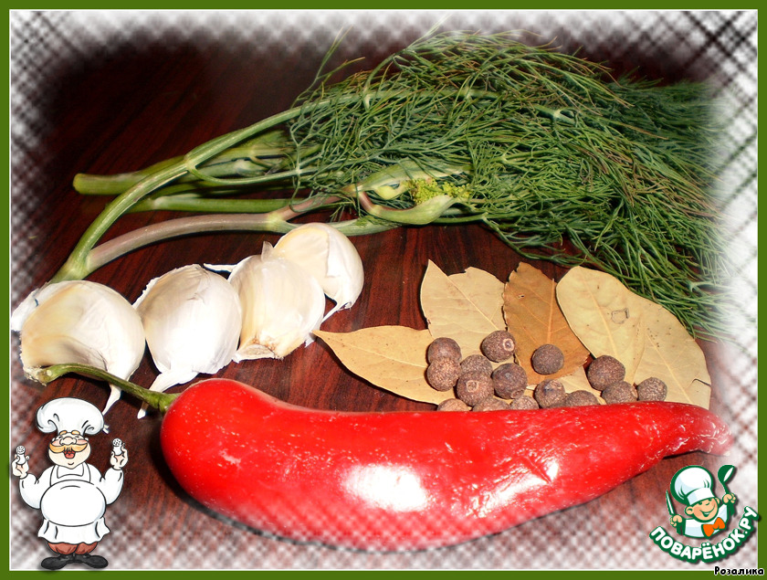Чеснок почистить, укроп, английский перец, лавровый лист помыть, острый красный перчик помыть, отрезать четверть.