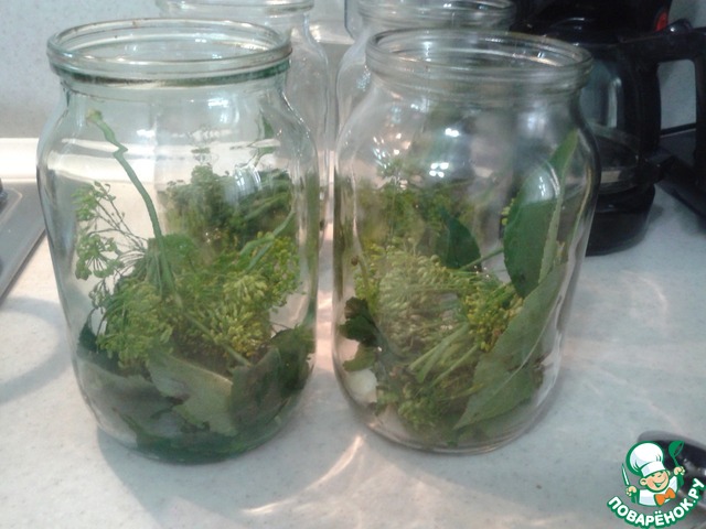 Подготавливаем банки - моем и стерилизуем. Раскладываем пряности.