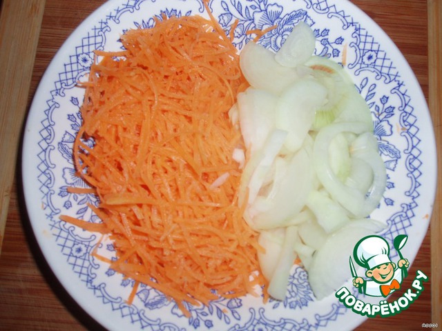 Морковь порезать соломкой или натереть на корейской терке. Лук порезать кольцами или полукольцами. Овощи залить кипятком и закрыть крышкой минут на 10. Это надо для того чтобы морковь хорошо прогрелась и все обошлось без взрывов. Водичку потом можно использовать в заливку. Порезать соломкой болгарский перец.