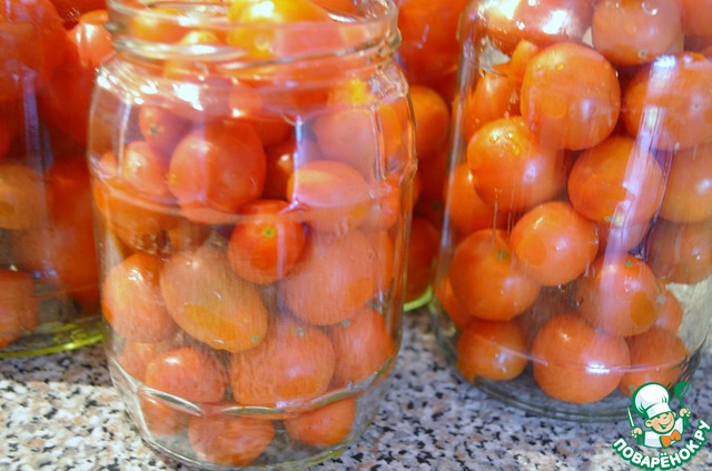 Подготовить банки: промыть, просушить и подержать в духовке при 110 градусах 10 минут. Вынуть, подождать, пока они остынут, и загрузить мытыми мелкими помидорчиками. Помидорки надколоть вилкой, чтобы кожа не лопалась.