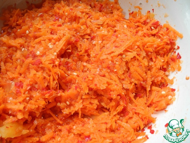 Чеснок, болгарский перец и острый перец- пропустить через мясорубку и смешать с морковкой.