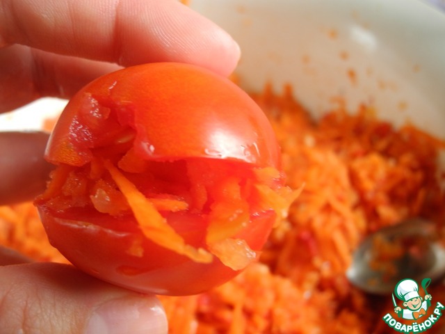 Начинить половинку помидора морковно-чесночно-пе речной смесью.
