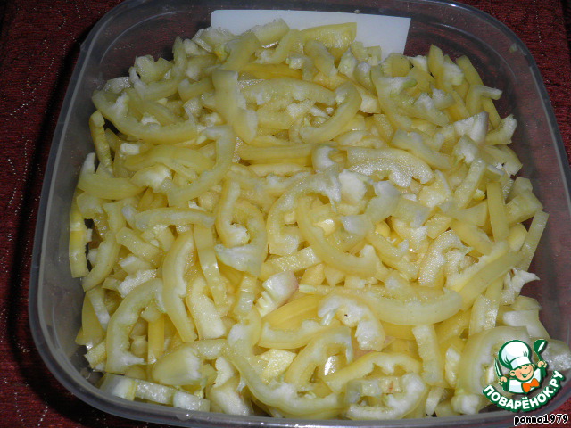 Болгарский перец нарезать некрупной соломкой.