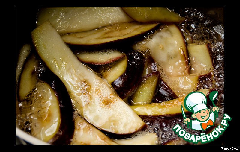 Уксус и небольшое количество воды смешать и довести до кипения на огне. Когда сия ядрeная смесь закипит, выложить туда баклажаны и проварить 2 минуты. Затем овощи вынуть шумовкой и переложить в какую-нибудь "дырявчатую" посуду или иное удобное вам приспособление, где баклажанчики смогут отдохнуть от уксусной пытки и "подсохнуть".