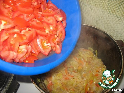 Помидоры помыть, порезать на 4 части и нашинковать. Добавить к овощам.