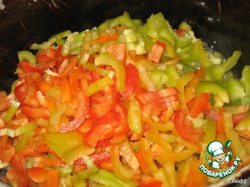 Перец болгарский помыть, очистить от плодоножки и семян. Разделить на 4 половинки и порезать соломкой. Добавить в поджаренный лук.