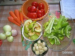 Перец помыть, порезать крупными кусками, удалив семечки, яблоки очистить от сердцевинок, чесной дольками, лук - чутвертинками.