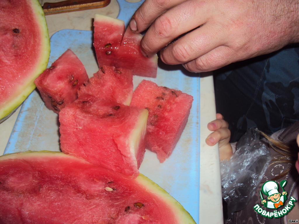 Арбуз вымыть, нарезать кубиками или ломтиками