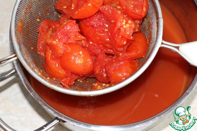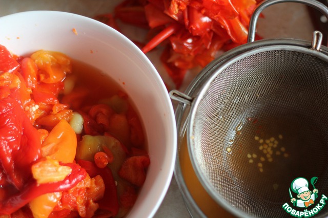 Кстати, с проваренного перца очень легко удаляется кожура, поэтому я варю его отдельно от томатов, чтоб лишний раз не тереть его через сито.