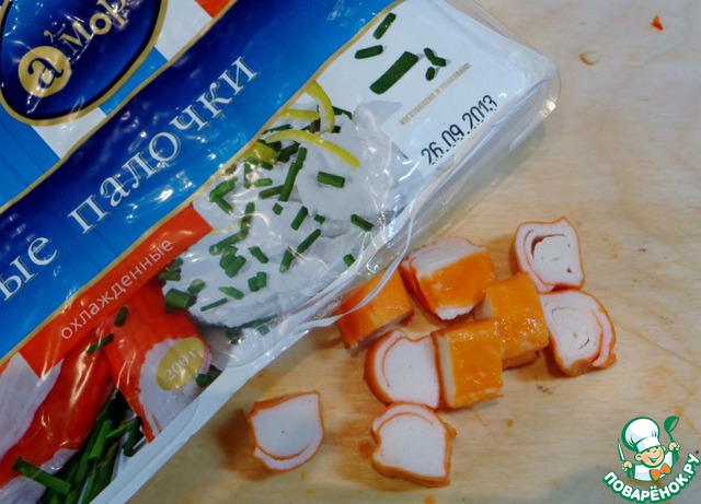 Крабовые палочки "А’море мио" нарезать кружками по количеству перцев.