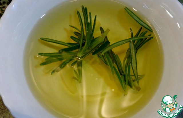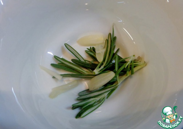 В отдельной посуде смешиваем веточки розмарина, нарезанный пластинками чеснок, соль по вкусу.