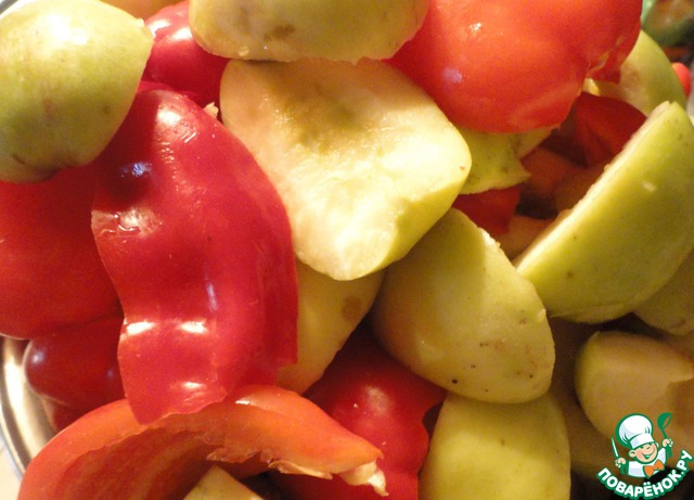Режем яблоки, болгарский перец, вычищаем из них середину.