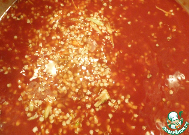 В сок добавляем соль, сахар, растительное масло. Доводим до кипения. Отправляем в кастрюлю перемолотые яблоки с болгарским перцем. Варим массу 10 минут