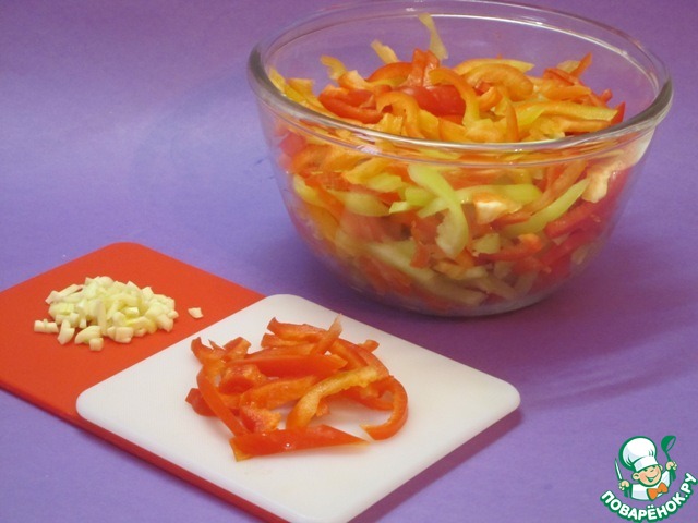 Перец вымыть, удалить сердцевину. Нарезать тонкой соломкой.