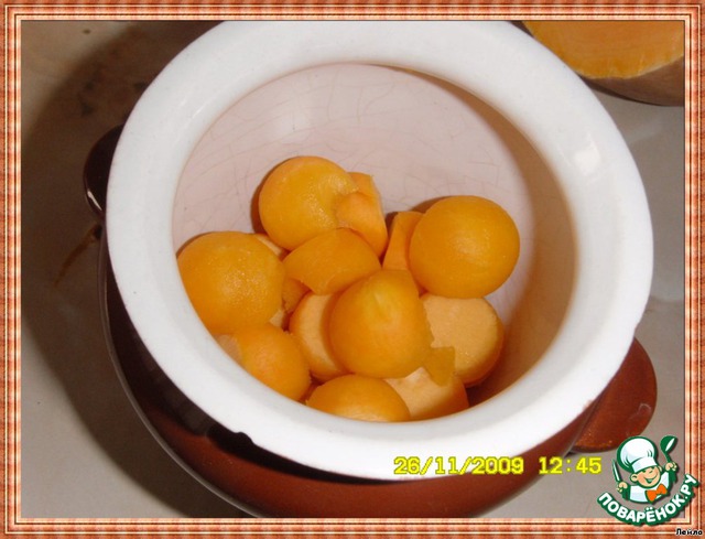 Нарежем тыкву на кусочки или нуазеткой, примерно полторы чашки.