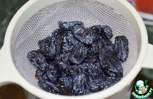 Изюм промыть и замочить в теплой воде на 5 мин., затем отбросить на дуршлаг.