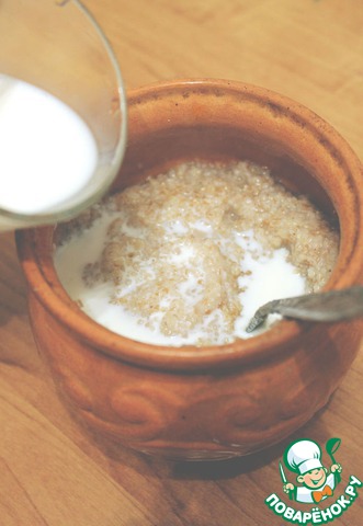 Вскипятить молоко и влить его понемногу в сваренную кашу, помешивая. Молока также брала меньше, столько же, сколько воды, когда заливала крупу. Молоко использовала 3,2 % жирности