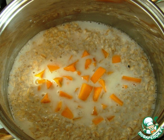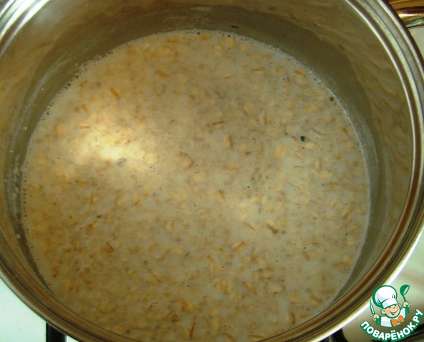 В небольшом сотейнике доводим до кипения молоко и воду. Отправляем туда овсяные хлопья. Перемешиваем.