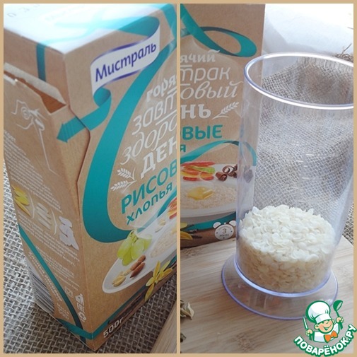 Отмерим рисовые хлопья. Так как на коробке в инструкции по приготовлению указано соотношение 1:2, то хлопья я сначала отмерила в милилитрах, а потом взвесила. Получилось 65г. Забегая вперед скажу, что в таком соотношении каша получилась густой и есть смысл для получения желаемой густоты соотношение хлопья/молоко менять. Хотя это -дело вкуса.