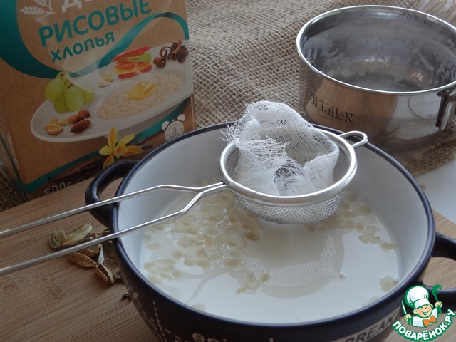 Поскольку для интерпретации Шир-брендж я беру рисовые хлопья (ТМ Мистраль, если вы заметили))), а не рис, то сначала займемся приготовлением кардамонового молока. Для этого истолчем в ступке зерна кардамона, отмерим молоко, вскипятим его, добавим толченый кардамон и сахар. Поварим минут пять.