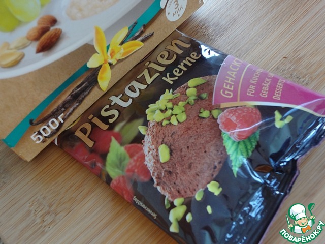 Пока завариваются хлопья, почистим и порубим фисташки. Для того, чтобы избавиться от "пленки" на орехах их замачивают в теплой воде минут на 10, а затем очищают. Я воспользовалась уже готовыми, чищенными и рублеными фисташками. Ни разу таких не видела в магазине. Это подарок Нины barska. Нинуль, СПАСИБО!!!