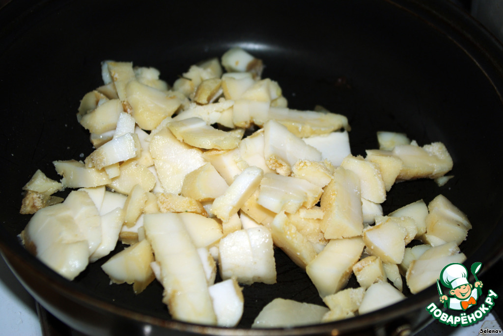 Нарезать сало (в оригинальном рецепте "ржавое", т.е. которое пожелтело от времени, у соседки такое нашлось :-)) небольшими кусочками, положить на сковородку...