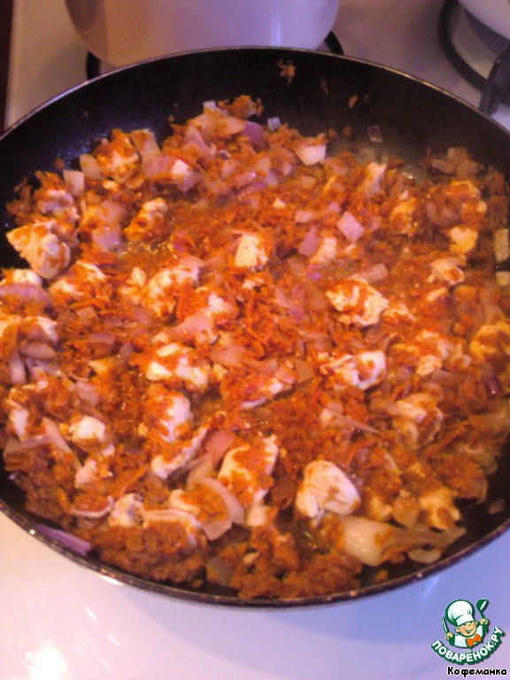 Подготовим зажарку: обжарим до золотистого цвета лук и натертую морковь. Зажарочку лучше посолить и поперчить сразу. Поскольку у меня оставалось немного куриного филе (кусочки некондиционные - после отбивных), то я поджарила с овощами и мяско.