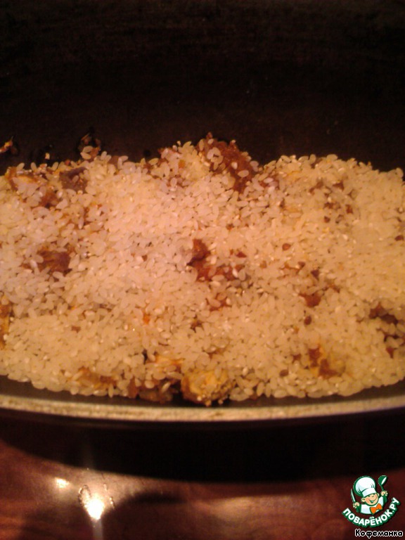 Опять слой зажарки. И, наконец-то, рис. Его желательно тоже накрыть овощами, да они у меня закончились! :\'(