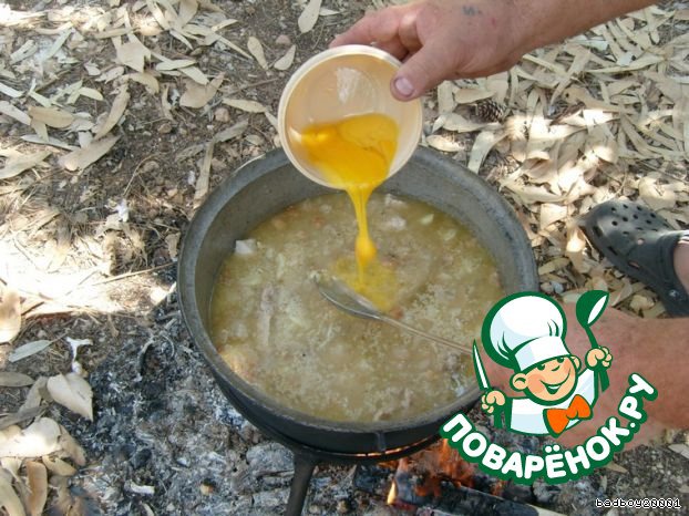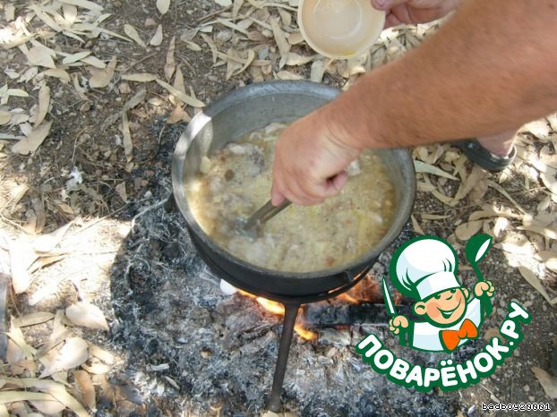 Если мясо и картофель готовы, добавляем кускус и варим минут 10-15, постоянно помешивая, чтобы кускус не пригорел, берем горящее полено и опускаем в кашу