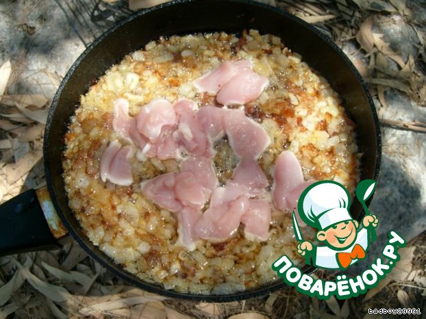 ... правильно! лук (чем больше, тем вкуснее), и жарим до золотистого цвета, добавим кусочки куриной грудки