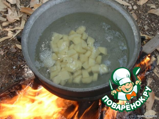 Налить воды из расчета, какая толпа и насколько голодны. Когда водичка закипела, солим и кладём картофель